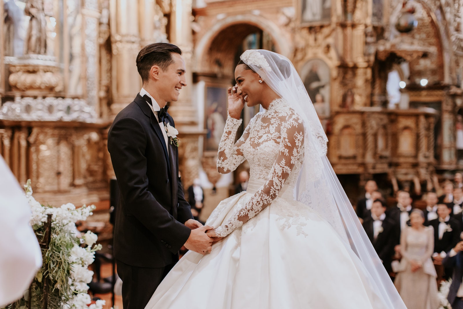 Jasmine Tookes and Juan David Borrero met through their jobs in 2016. Juan works at Snapchat as a director of international markets, and the social media app was getting ready to launch a new feature called Group Stories. The company wanted to hire Jasmine and her friends to promote it. “We all happened to be in L.A. for a fashion show, so I went to lunch with Juan and a couple other Snapchat employees,” Jasmine remembers. “Following that lunch, Juan invited me to a birthday party that same night. There was a natural attraction to each other. We kept in touch since that night, and the rest is history.”