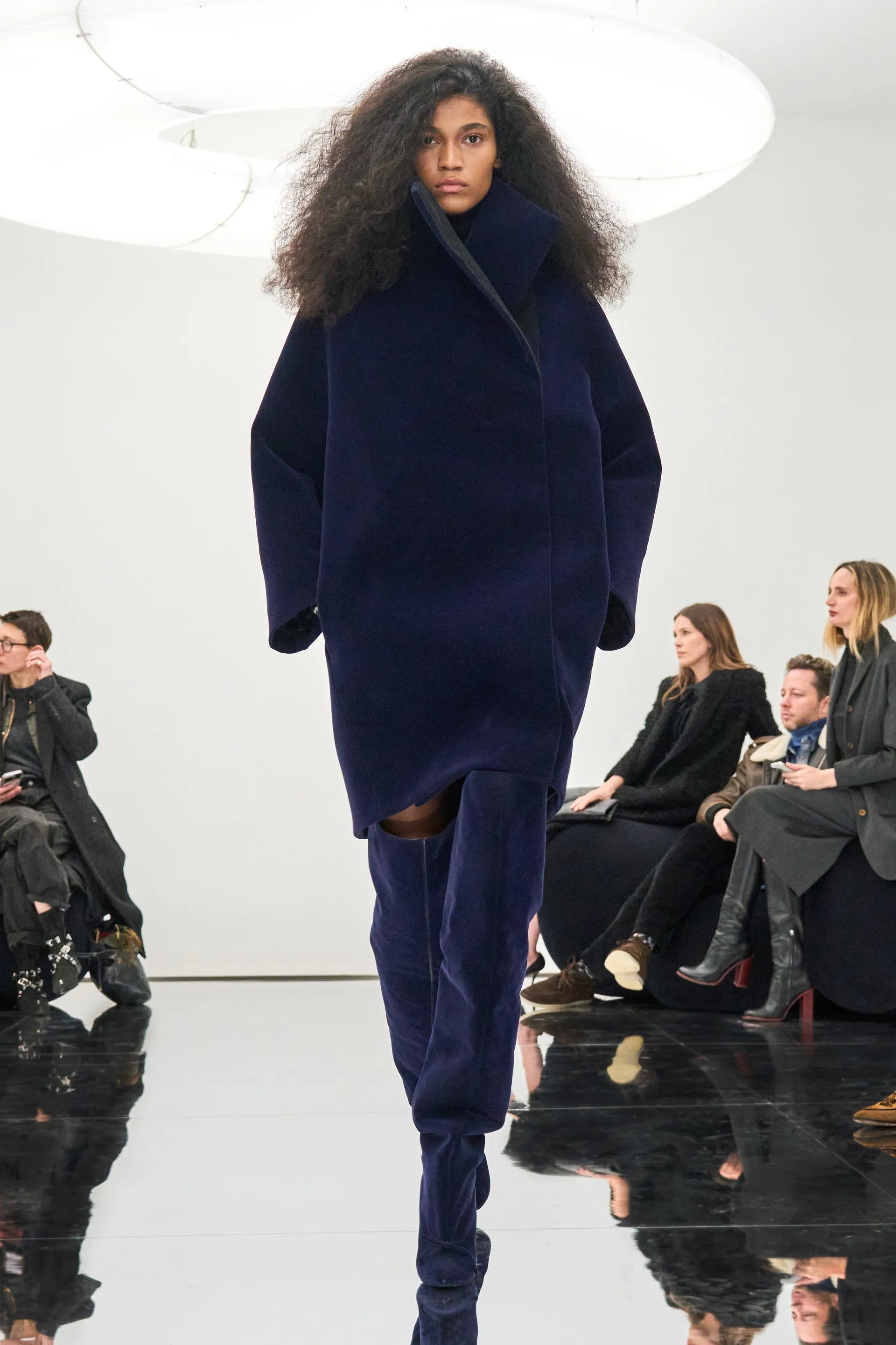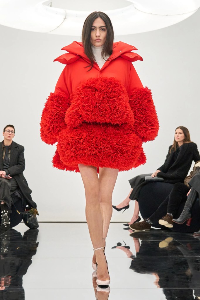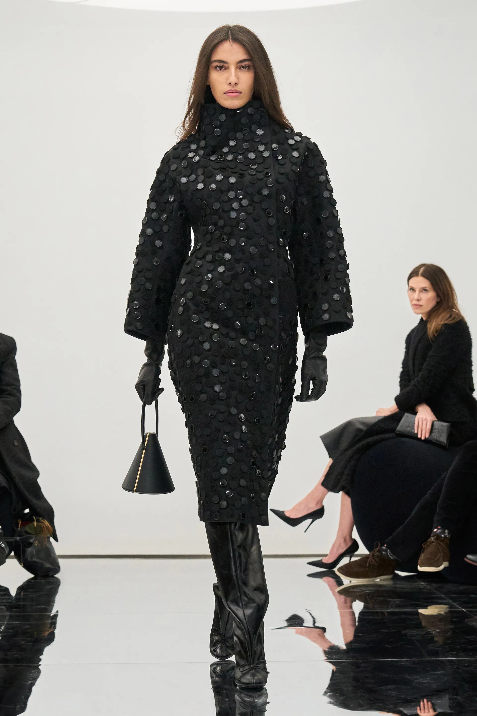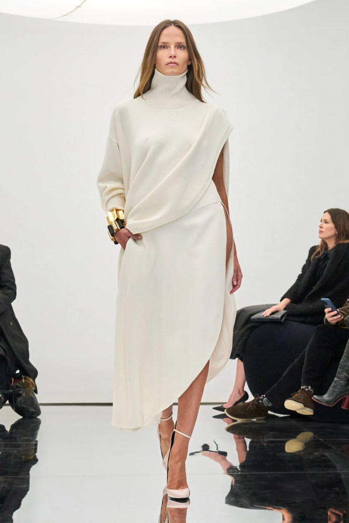 What stood out in this collection was Mulier’s commitment to a singular material—merino wool. From deconstructed knitwear to sculptural coats and asymmetrical dresses, every piece was crafted from this versatile material, demonstrating a year-long exploration with a couple of select suppliers. Despite the technically exceptional and mathematically mind-blowing nature of the collection, Mulier humbly described it as “simple,” emphasizing its grounding in circles and a straightforward elegance.