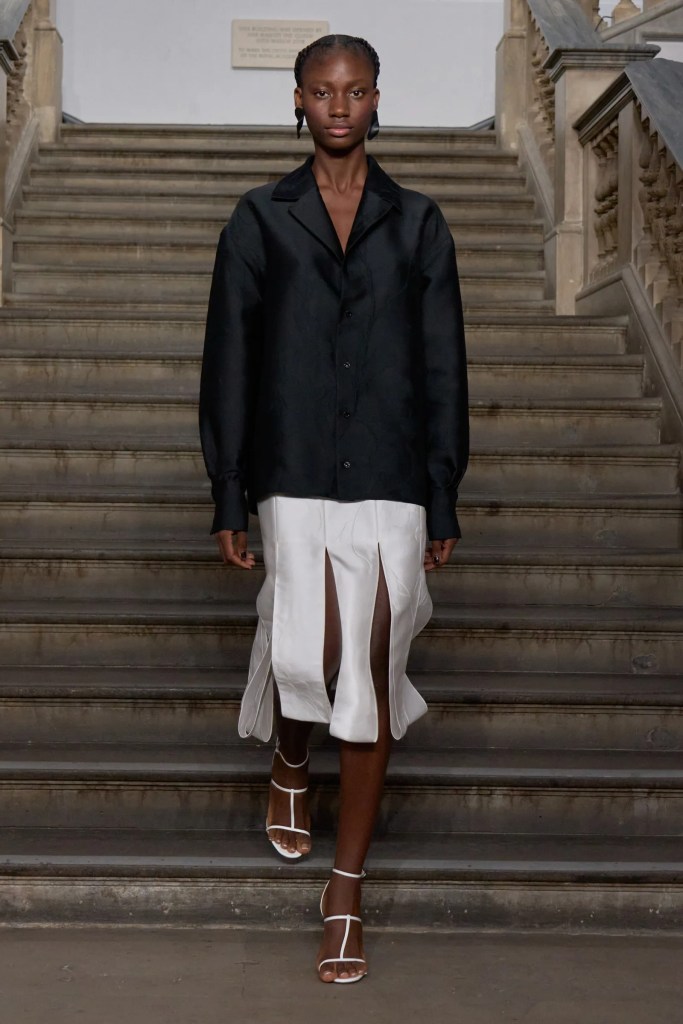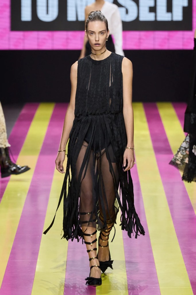 Followed throughout the season, the influence of “the modern flapper” trend is evident in the opulent fringing, radiant headpieces, and drop-waist dresses reminiscent of 1920s baby vamps. In a contemporary remix for 2024, Prada introduces a novel touch to this iconic style with the addition of leather barn jackets and blazers, showcasing an evolution that seamlessly blends vintage inspiration with modern sophistication.
