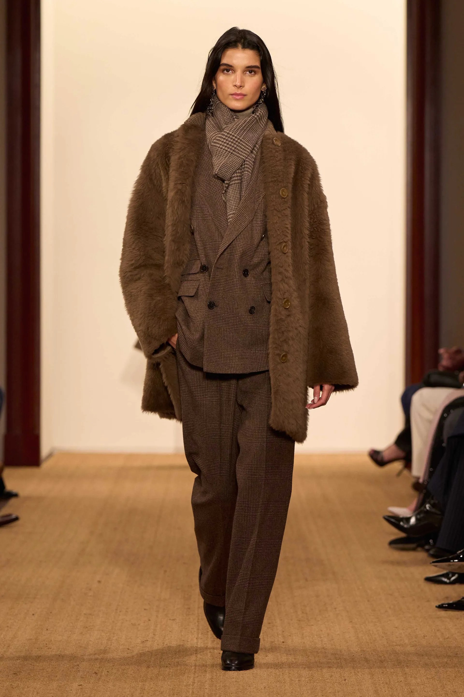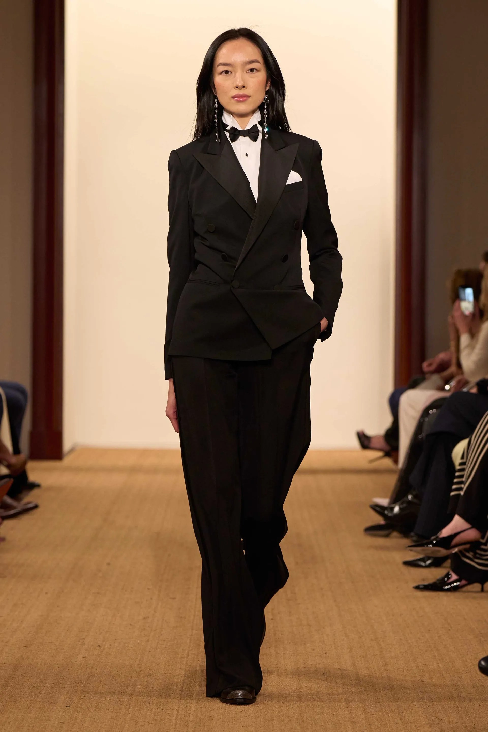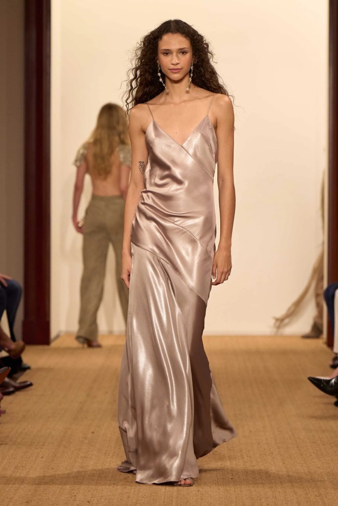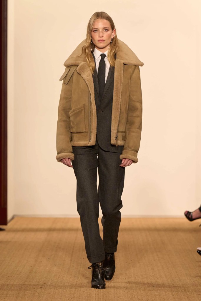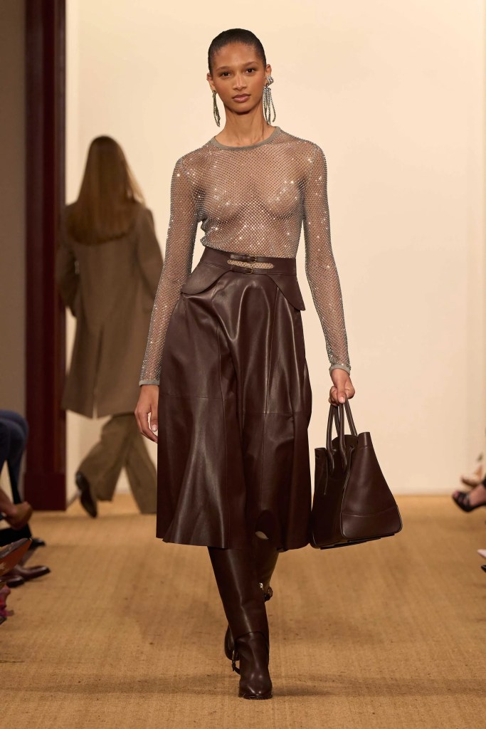 The collection unfolded like scenes from a classic film, each ensemble a testament to Lauren’s mastery of style. From the rugged allure of leather jackets and suede pants to the refined elegance of pinstripe jackets and silk charmeuse shirts, every look spoke of sophistication and allure. Yet, it was the beaded gowns that stole the show, shimmering like stars in the night sky, leaving trails of diamond-bright light in their wake.
