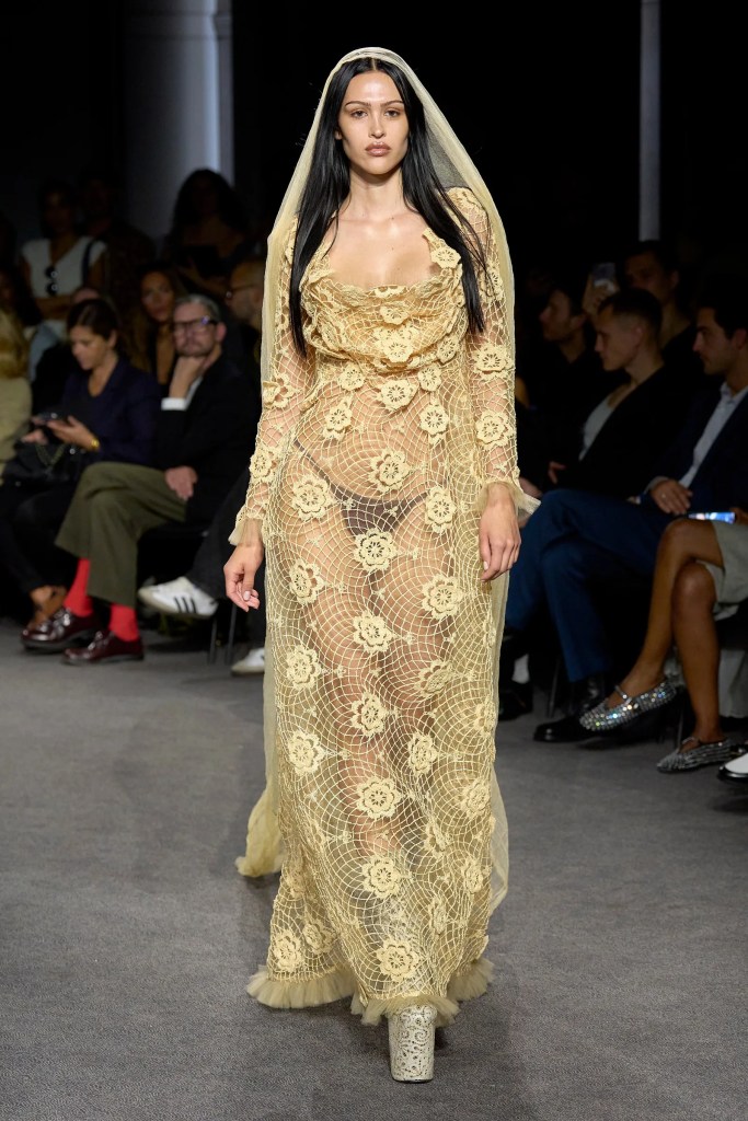 Meanwhile, at Diesel, Glenn Martens is making waves with his avant-garde approach. He transforms deadstock denim and jersey into party dresses with a unique paint-peel effect and repurposes old movie posters into eye-catching jackets. These innovative designs highlight the brand’s commitment to sustainability and bold aesthetics.