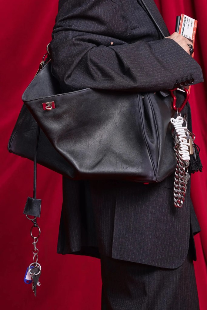 Stefan Cooke’s collaboration with Mulberry showcased bags adorned with quirky charms and foam fingers, adding a playful twist. Bottega Veneta’s bags exuded gym bag vibes, filled with rolled-up newspapers and spare shirts, capturing the essence of an on-the-go lifestyle. Givenchy’s totes were weighed down with an assortment of keychains and trinkets, adding a touch of whimsy and realism. Prada took a unique turn with their new bag clasp—a tiny man’s head, merging fashion with art.