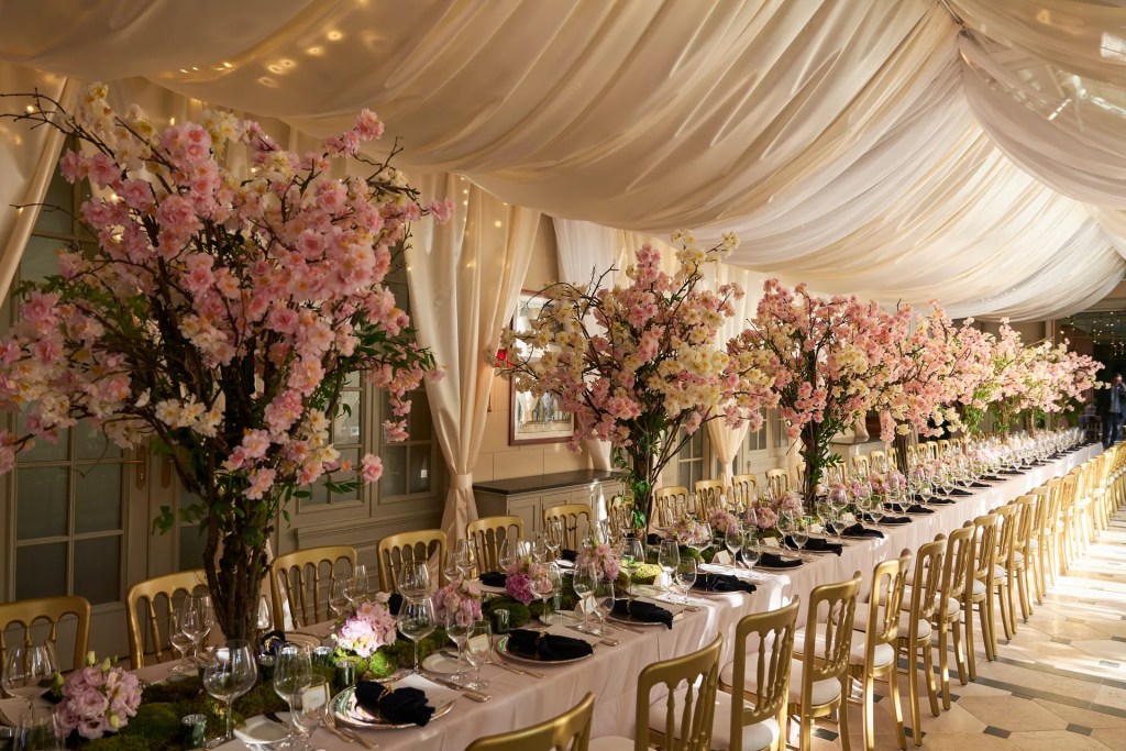 The celebration began with a cocktail reception at the hotel. Olivia wore a short pink Simkhai dress for photos, then changed into Giambattista Valli Haute Couture. The event featured a hot pink carpet, lush greenery, floral arrangements, and a dramatic dining room with cherry-blossom centrepieces.