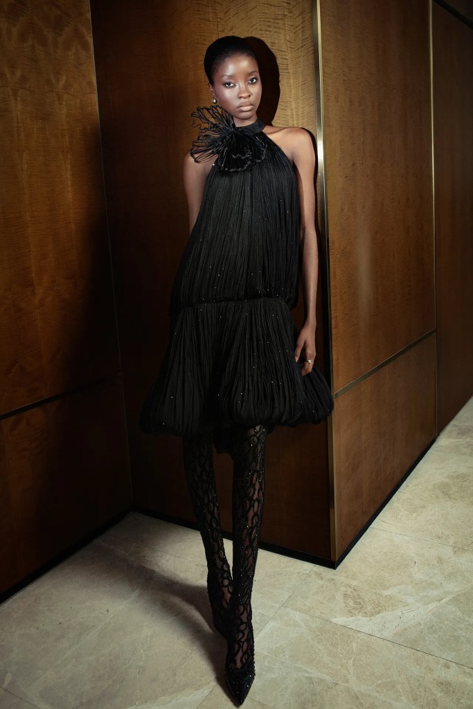 This cultural homage translated into garments featuring rich, glossy textures, deep earthy tones, and meticulously hand-embroidered details. Silhouettes were a blend of structured and flowing, with tailored suits paired alongside ethereal dresses. The use of luxurious fabrics like silk and velvet added a touch of opulence, while asymmetrical cuts and layered designs gave a modern edge.