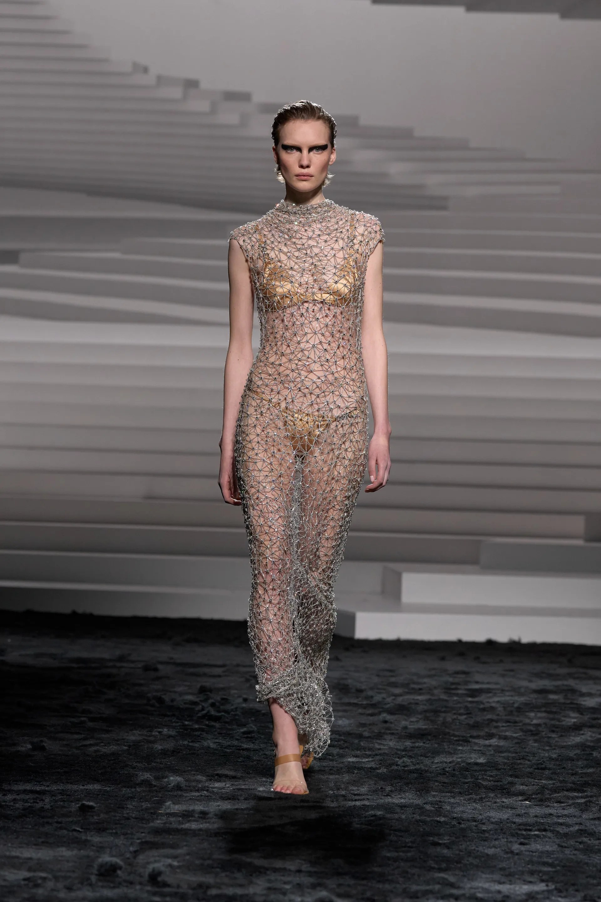 Notable details included dainty white collars, lifted from a 1993 show, and dramatic hourglass dresses with daring slits and crystal embellishments. One red leather cocktail dress, also worn by Anne Hathaway, was an architectural marvel. We expect to see these looks on the red carpet soon!