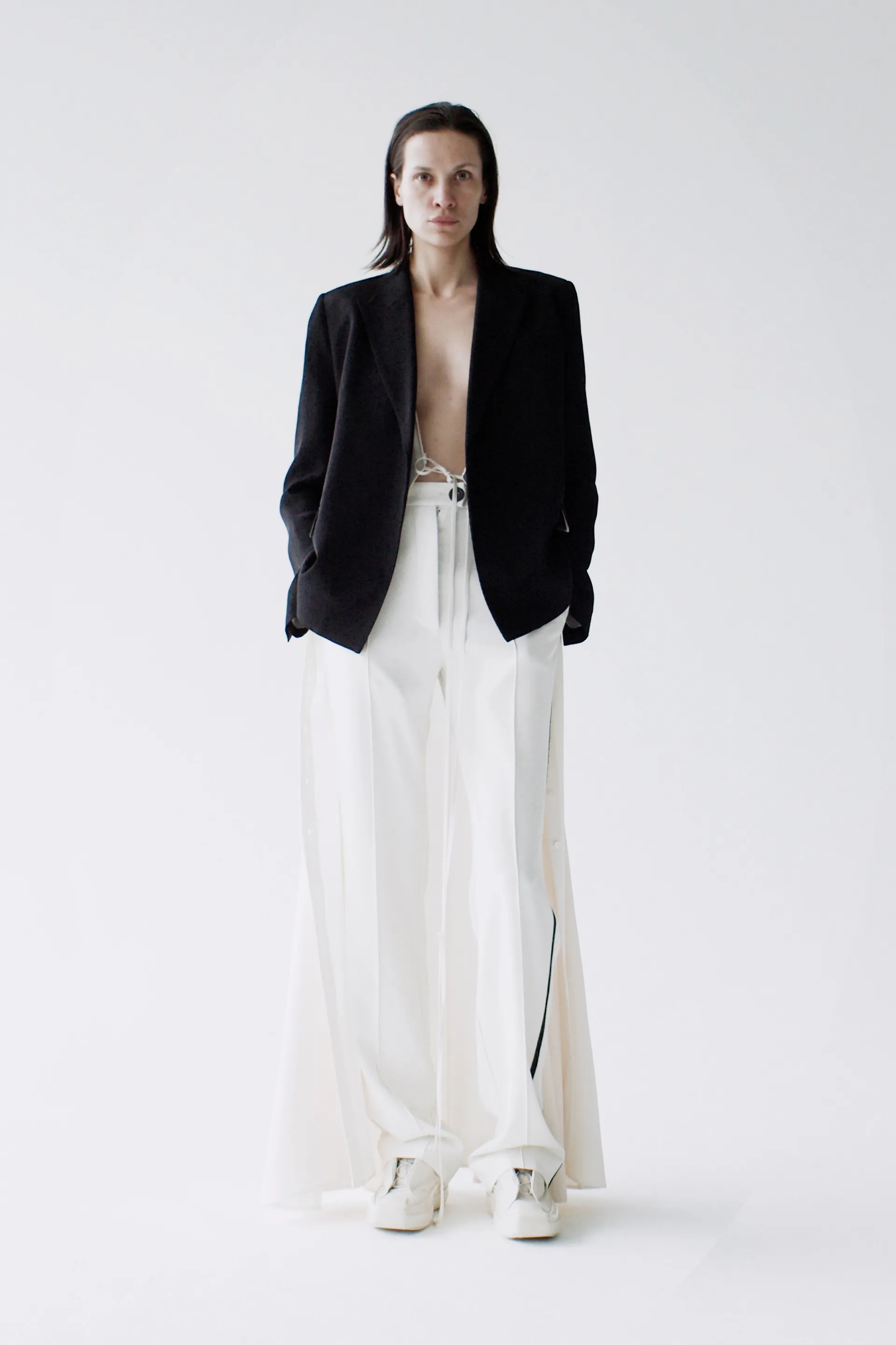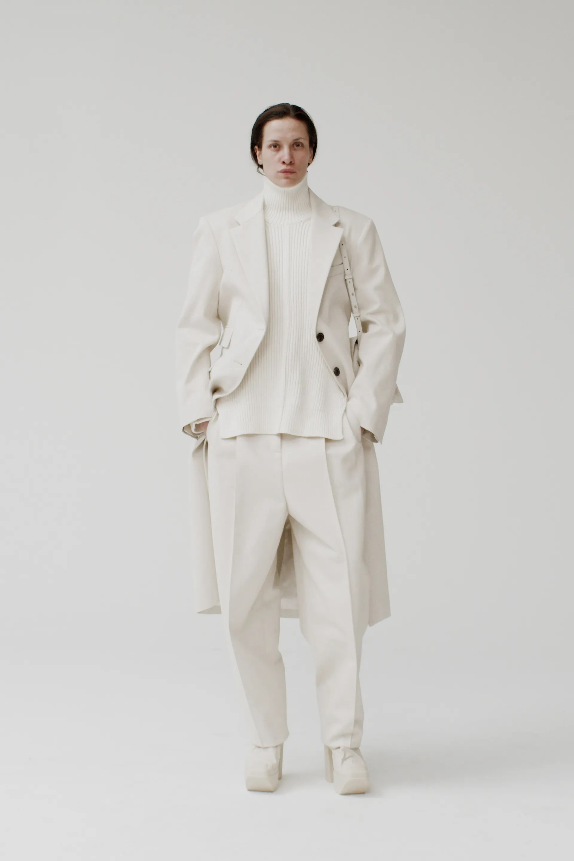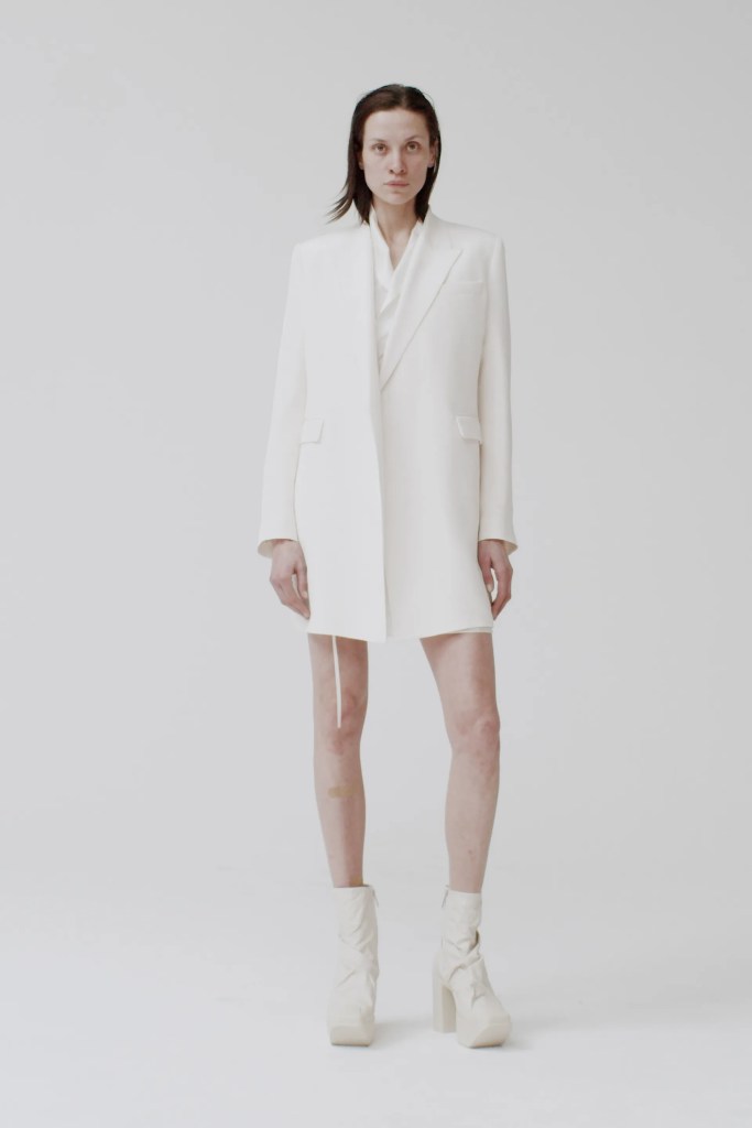 True to his modular dressing concept, Do focused on versatility. Notable pieces included a “Suture” suit with functional sleeve buttons for boardroom power flexing and a silk twill minidress that could be styled two ways.