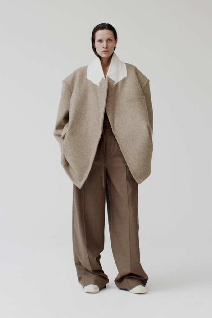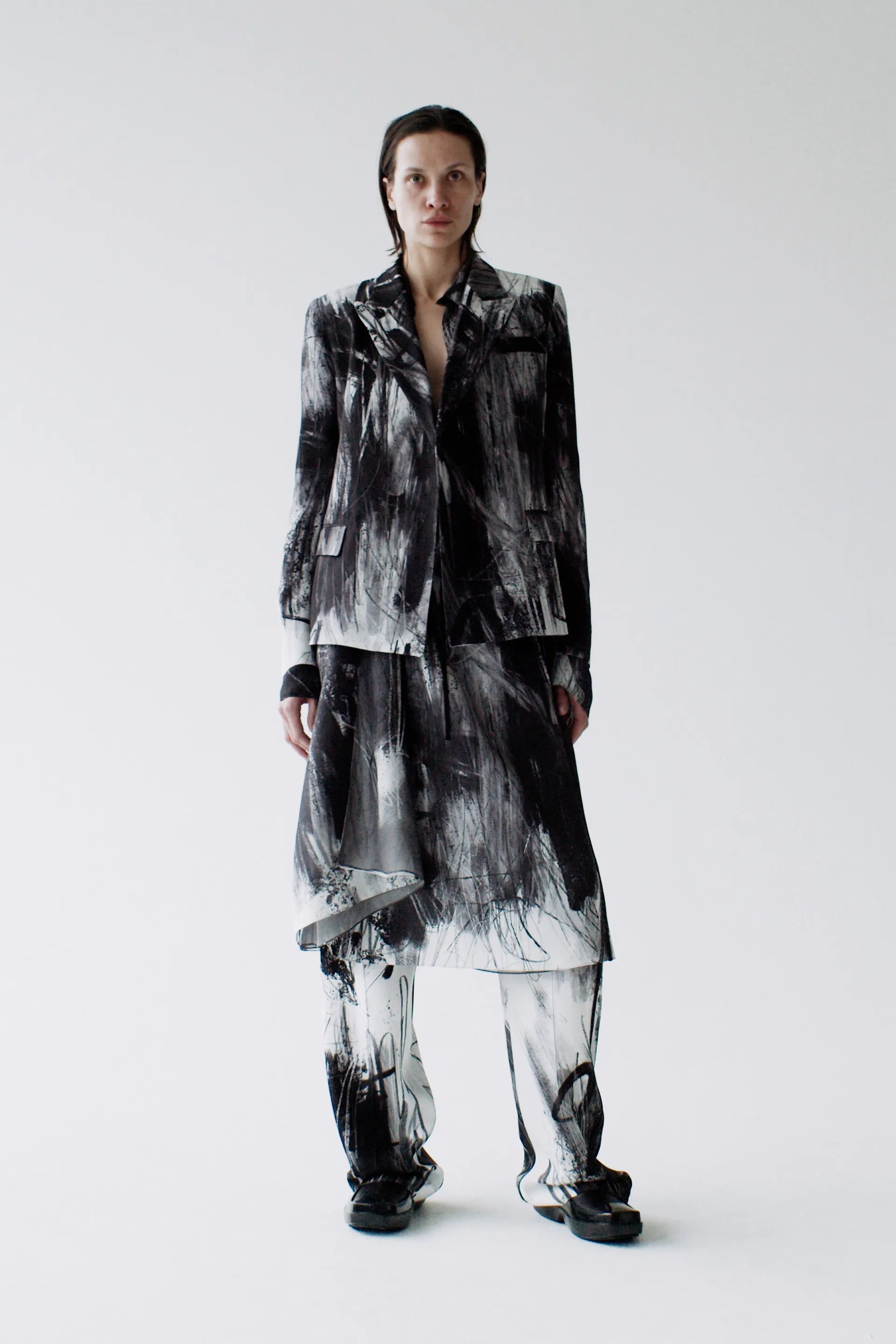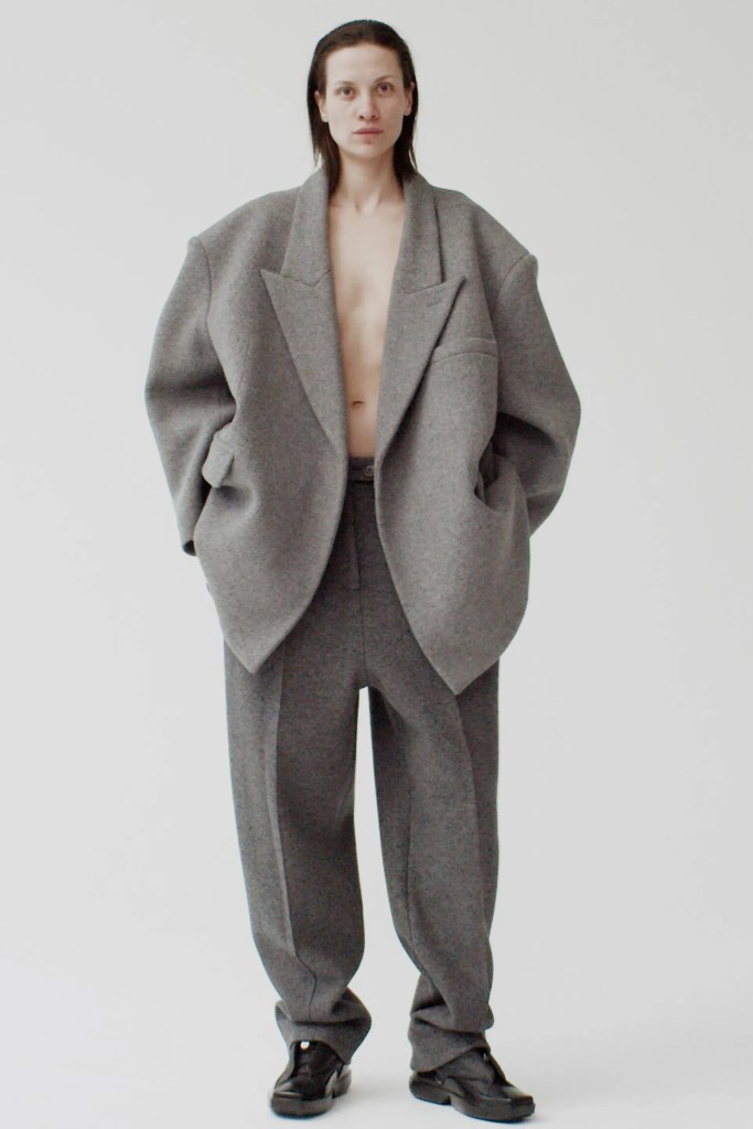 A standout piece of the collection was the black-and-white abstract print pantsuit, softened with a matching wrap skirt tied loosely at the hips. The collection also featured his signature oversized blazer in padded black satin and cosy grey knit, evoking a mix of luxury loungewear and chic outerwear.