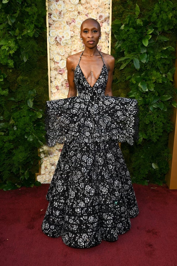 Known for her fearless fashion choices, Cynthia stunned in a plunging neckline dress by Louis Vuitton, featuring exaggerated hips in a striking black-and-white design. Styled by Jason Bolden, her bold look exuded confidence and sophistication.