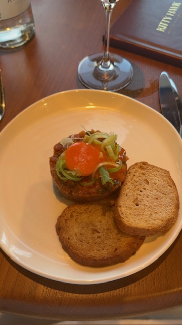 To start, we ordered the Hereford steak tartare with egg yolk and sourdough rich, silky, and perfectly seasoned. Alongside it came the crunchy coconut prawns, served with jalapeño and lime, and a fresh mint and coriander chutney. The flavour combo? Unreal.