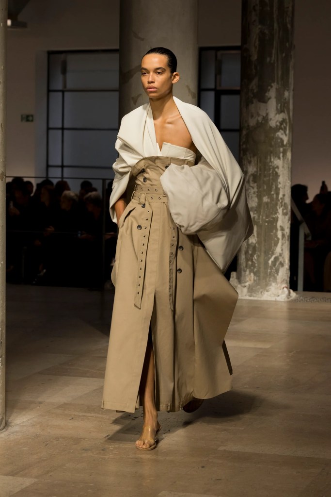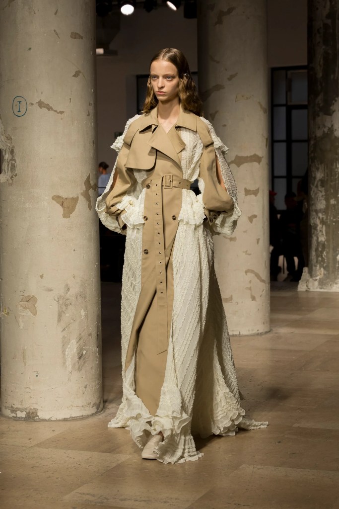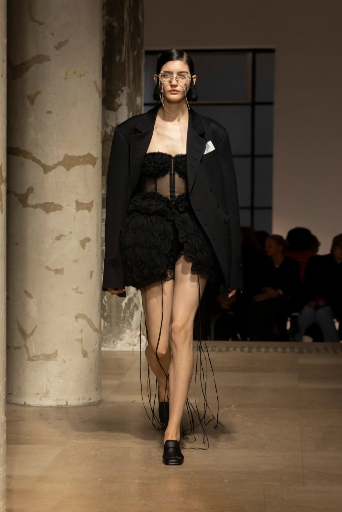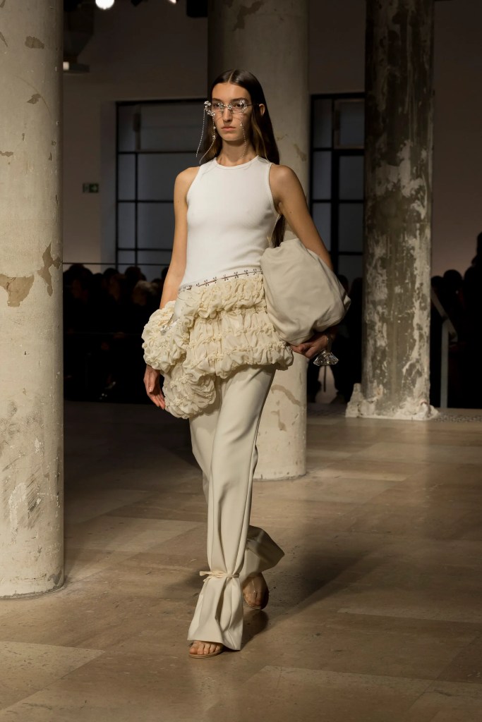 Designer Rok Hwang gave us soft romance layered with cool-girl edge, balancing delicate ruching with deconstructed silhouettes. Off-white panniers, draped trousers, and asymmetrical ruffles brought movement and drama without losing wearability. It’s giving art-school rebel meets garden-party chic and we’re obsessed.