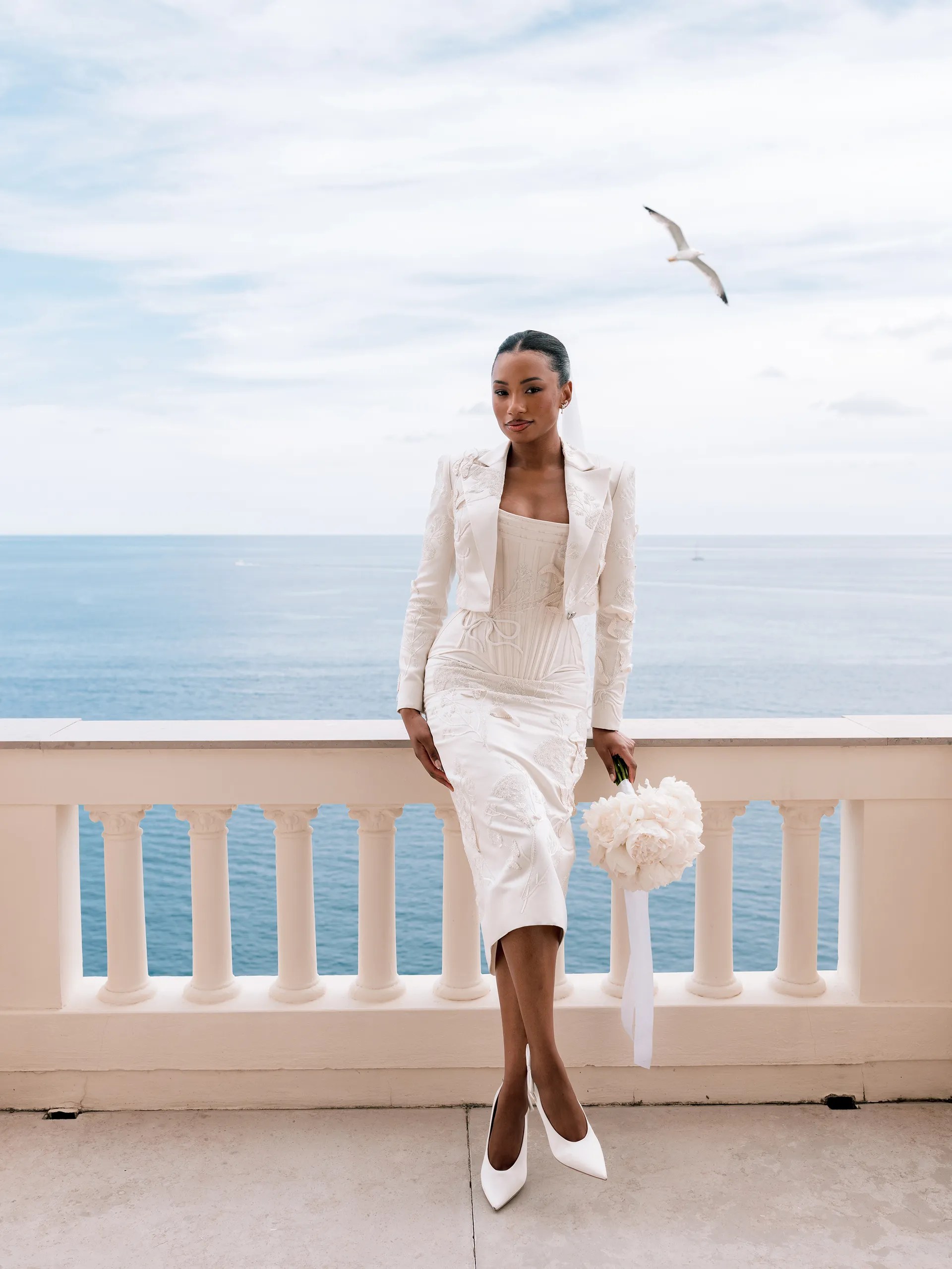 In Monaco, she kept it sharp and modern with a perfectly tailored Wiederhoeft suit, accessorised with sparkling touches from Briony Raymond. Sleek, minimal, and very “I’m the boss here.”