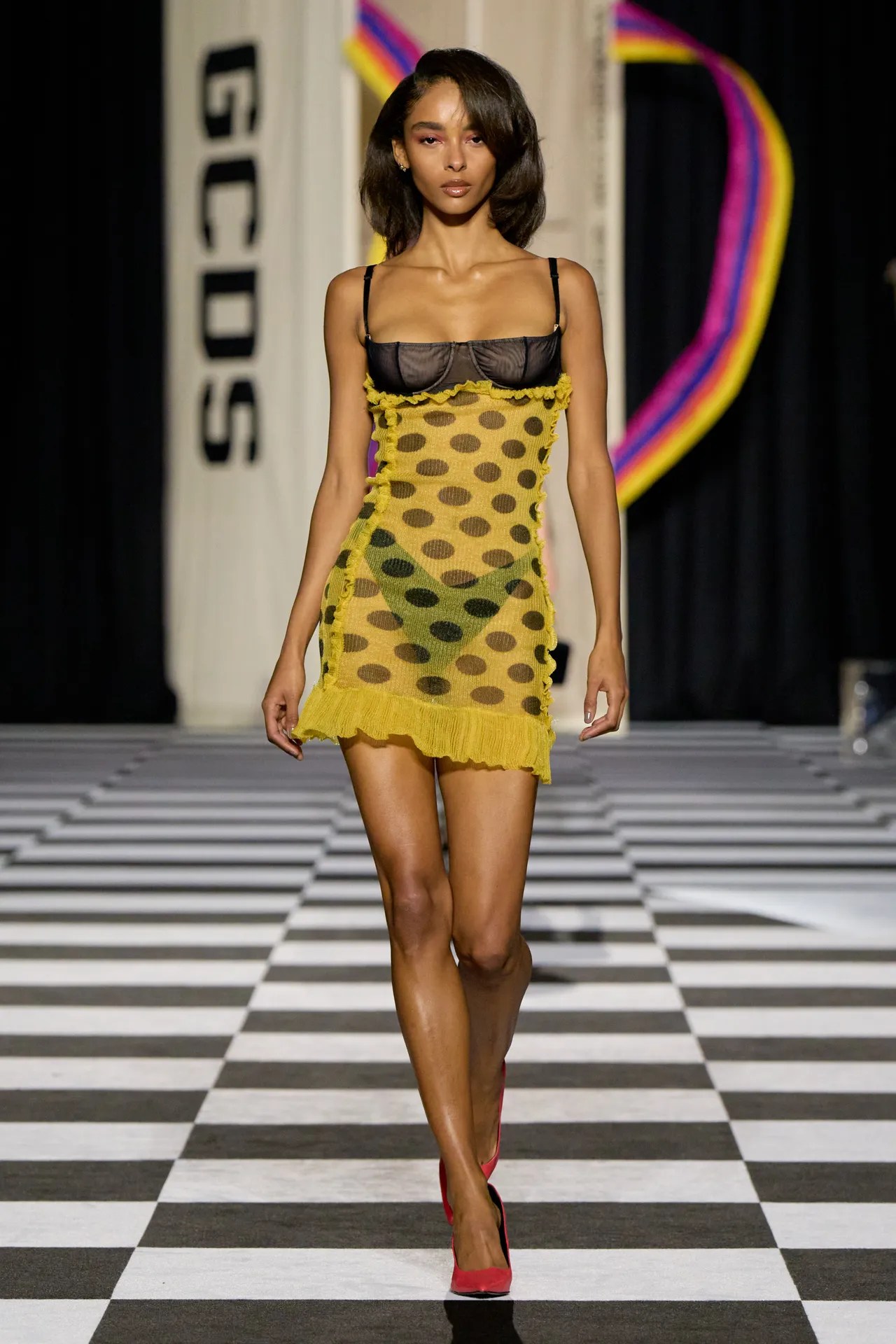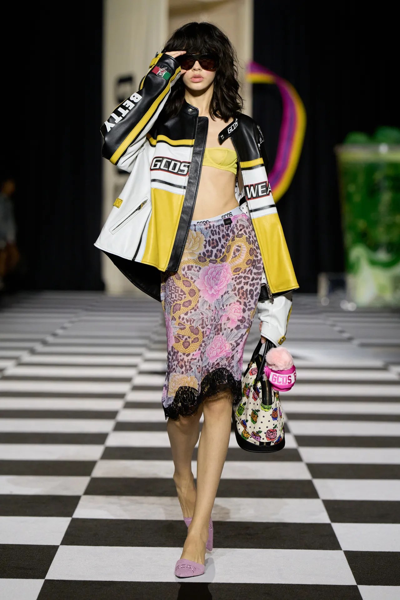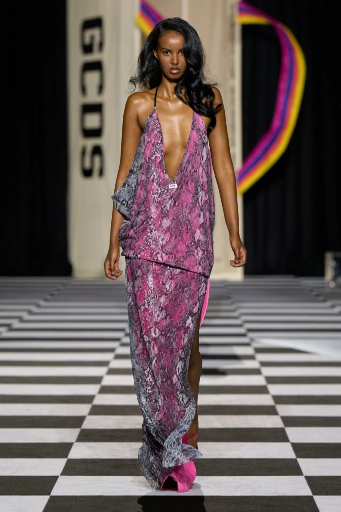 Built around the viral “what’s in my bag?” concept, the collection leaned heavily into digital culture, nostalgia, and hyper-sexualised aesthetics. Cartoon graphics, statement prints, and pop-culture references—like Betty Boop—dominated the runway, reinforcing GCDS’s signature irreverent identity.
